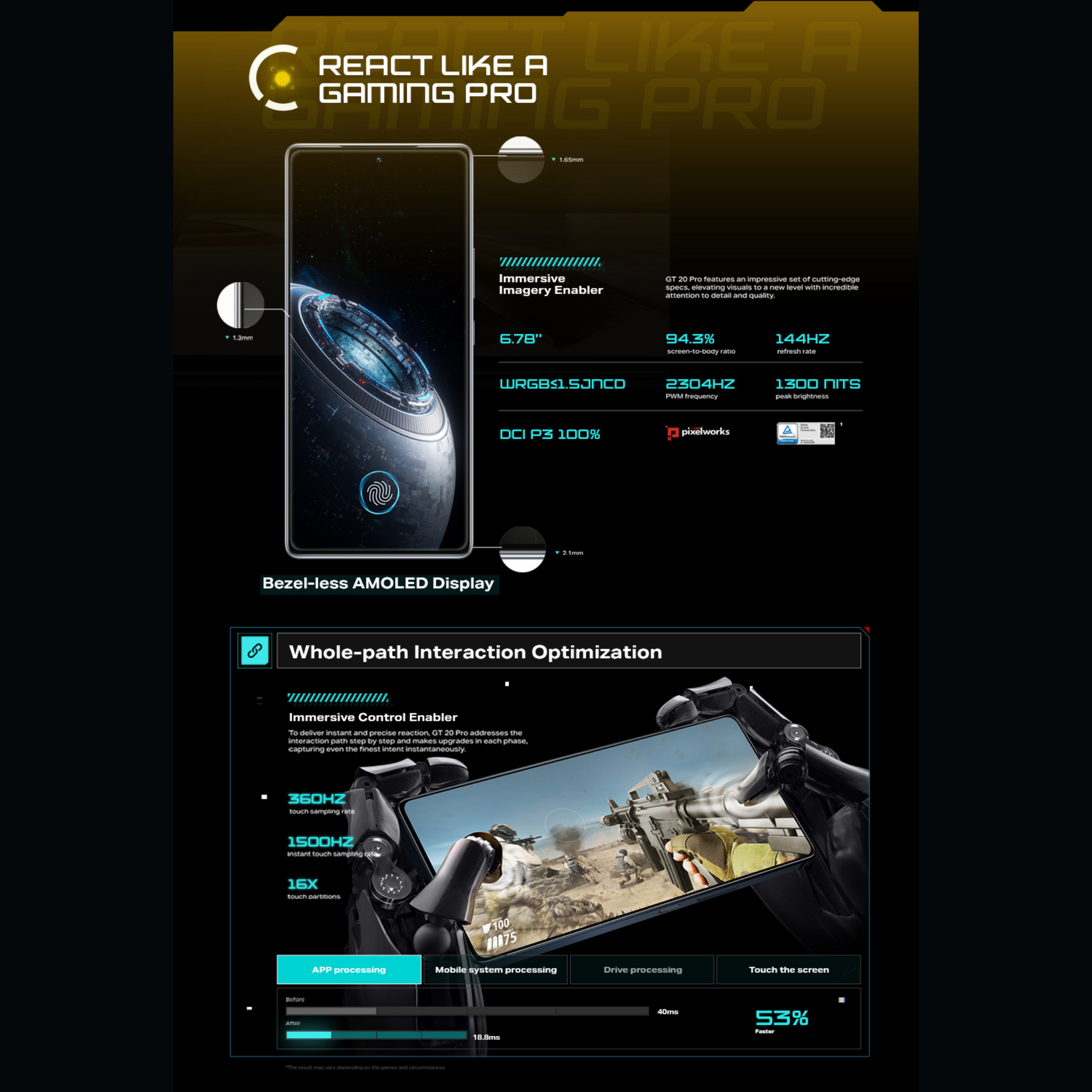 | Display | 6.78" AMOLED, 144Hz refresh rate, 1080 x 2436 FHD+ resolution, 388 PPI, 1300 nits peak brightness |